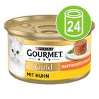 Η Purina Gourmet Gold με γέμιση είναι ένα ακαταμάχητο πατέ με γέμιση από ζουμερή, νόστιμη σάλτσα. Το αρωματικό πατέ σε προσκαλεί να το δαγκώσεις. Στη συνέχεια, η μαλακή γέμιση εκπλήσσει ευχάριστα τον ουρανίσκο της γάτας με τη ζουμερή της σύσταση και την ακαταμάχητη γεύση. 4 διαφορετικές ποικιλίες με βοδινό, κοτόπουλο, σολομό ή τόνο παρέχουν μια νόστιμη εναλλαγή στο μπολ της γάτας. Μια λιχουδιά για κάθε γκουρμε γάτα!